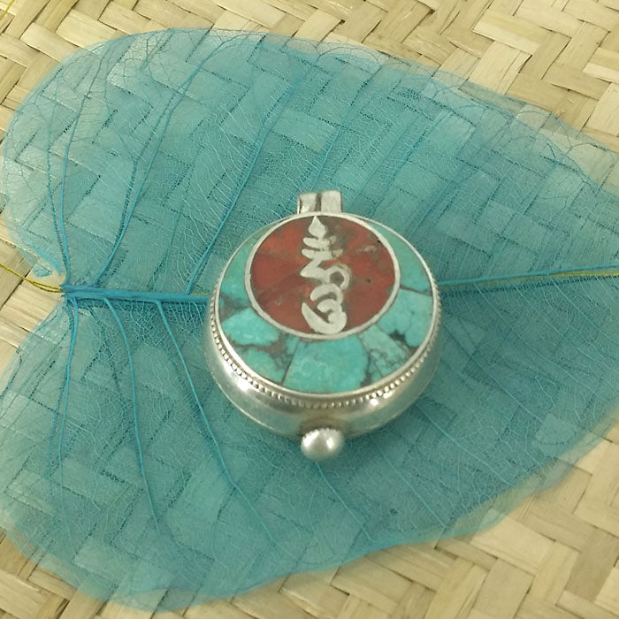 This sterling silver Sun & Moon Ghau is approximately 1.5 Inches in length, 1.25 inches in diameter and weighs 11 grams. This Ghau has “Sun & Moon” symbol on the front with Turquoise & Coral and Kalachakra Symbol on the back. Ghau is also known as prayer box pendant or amulet to keep small sacred items. Traditionally it is used as portable alter or shrines where prayers and sacred relics are kept. Ghau often have intricate designs, auspicious symbols, and mantras with semi-precious gemstone with healing effects like turquoise, lapis lazuli or coral.