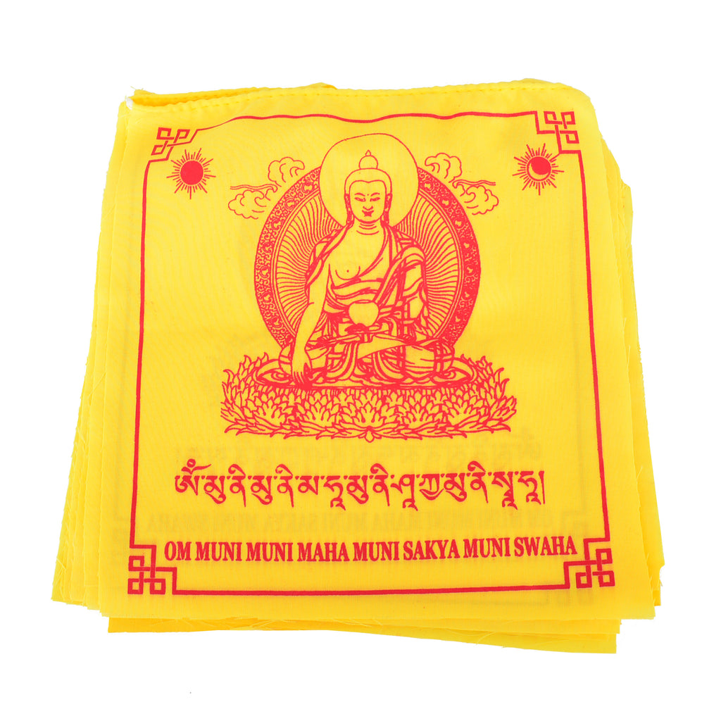 This Shakyamuni Buddha Prayer Flag comes in a set of 10 prayer flags, all in Yellow color. This prayer flag is handmade in Nepal and is 9 ft. long. Each prayer flag measures 9 Inches tall and 9 Inches wide. Prayer flags are auspicious flags that contain images of deities, Mantras and prayers which are traditionally believed to bring happiness, peace, prosperity, good fortune, health and victory over the obstacles. Prayer flags are used to promote peace, compassion, strength and wisdom. Prayers inscribed on prayer flags protect from destructive evils and obstacles toward the flag planter and all sentient beings.